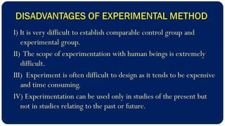 The advantages and disadvantages of experimental research show that it is a useful system to use but it must be tightly controlled in order to be beneficial. A single sentence purpose statement should define a roadmap. This kind of research activity is very helpful for producing data points when looking.